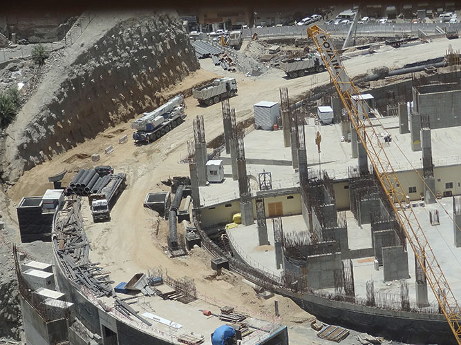 The complex holds several world records; (1) the tallest clock tower in the world: 601 m (1,972 ft); (2) the world's largest clock face; and (3) the building with the world's largest floor area. The complex's hotel tower became the second tallest building in the world in 2012, surpassing Taiwan's Taipei 101 and surpassed only by Dubai's Burj Khalifa. The building complex is metres away from the world's largest mosque and Islam's most sacred site, the Masjid al Haram. The developer and contractor of the complex is the Saudi Binladin Group, the Kingdom's largest construction company. [now where have I heard that name before ?]