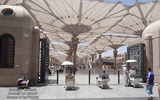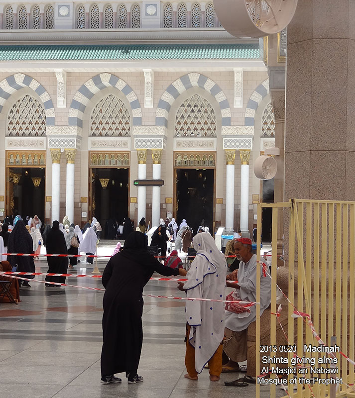 1: Street scene just outside our InterContinental hotel at Madinah -enlarge 2: a typical car we saw in Saudi - no interest in fixing dings & scratches- no pride of ownership. I'm told they have to report each indcedent to police if they make an ins claim-enlarge 3: Shinta at a local street market-enlarge 4: Shinta at Madinah street market. Al-Masjid al-Nabawī or the Prophet's Mosque at the rear-enlarge 5: Entrance to Al-Masjid al-Nabawī, Mosque of the Prophet. The giant umbrellas are folded up at night.-enlarge 6: Al-Masjid al-Nabawī-enlarge 7: Shinta at the Prophet's Mosque-enlarge 8: Shinta at Prophet's Mosque-enlarge 9: Duncan at Al-Masjid al-Nabawī, Mosque of the Prophet-enlarge 10: Madinah is surrounded by hills-enlarge 11: Entering Al-Masjid al-Nabawī, Mosque of the Prophet-enlarge 12: Shinta at the Prophet's Mosque-enlarge 13: Shinta outside the Womans Door at the Prophet's Mosque-enlarge 14: Shinta giving alms-enlarge 15: Prophet's Mosque - womans door - -enlarge 16: Prophet's Mosque-enlarge 17: Prophet's Mosque-enlarge 18: Prophet's Mosque-enlarge 19: Call to prayer-enlarge 20: Mosque of the Prophet-enlarge 21: Praying in the Mosque of the Prophet-enlarge 22: Muhammad's tomb -enlarge 23: Muhammad's tomb -enlarge 24: behind the Prophet's tomb. The military are pretty casual.-enlarge 25: Praying at the Prophet's Tomb-enlarge 26: Mosque of the Prophet -enlarge 27: The two Green Zone Guardians who I met. 'Australi, Australi, Muslim Australi?'-enlarge 28: Mosque of the Prophet -enlarge 29: to Madinah-enlarge 30: Prophet's Mosque -enlarge 31: Mosque of the Prophet, Green zone -enlarge 32: Mosque of the Prophet-enlarge 33: Prophet's Mosque - Abdullah-enlarge 34: Mosque of the Prophet- Duncan & Abdullah -enlarge 35: Shinta & Abdullah-enlarge 36: Duncan & Shinta -enlarge